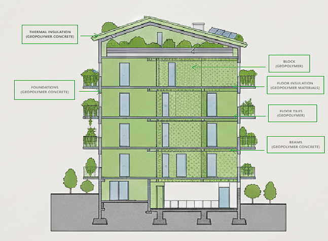 Face à ceci, les géopolymères, le biociment, le ciment complété de pouzzolane et de nombreux autres nouveaux matériaux constituent des exemples de matériaux « verts ». Concentrons-nous, plus particulièrement, aux géopolymères, qui semblent être privilégiés en raison de leurs multiples avantages économiques et environnementaux : les géopolymères sont des matériaux polymères inorganiques issus de sous-produits industriels tels que les cendres volantes (provenant des centrales thermiques), la scorie des hauts fourneaux (provenant de la sidérurgie). Ils améliorent la résistance et la durabilité des constructions. Le terme est composé : le premier élément étant « gé » qui désigne les matériaux présents dans l’écorce terrestre (l’alumine et l’oxyde de silicium), et le second mot est « polymères ». Ceux-ci sont des matériaux créés par la synthèse de polymères. Par conséquent, « géopolymère » signifie polymère inorganique provenant de minéraux naturels. En raison de leurs propriétés exceptionnelles, ils sont utilisés dans la production de matériaux de construction tels que les briques, les carreaux de céramique, les mortiers et le béton, dans la construction de surfaces structurelles résistantes, de sous-couches à faible perméabilité, de matériaux de protection contre le feu, etc.