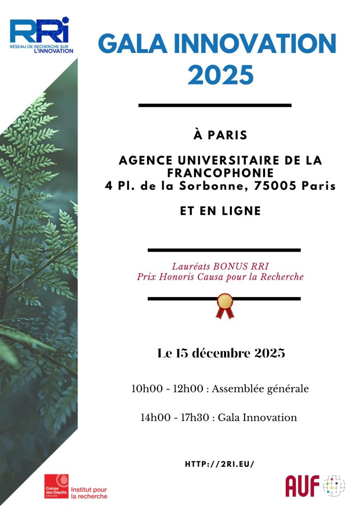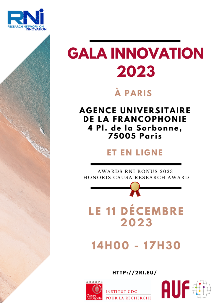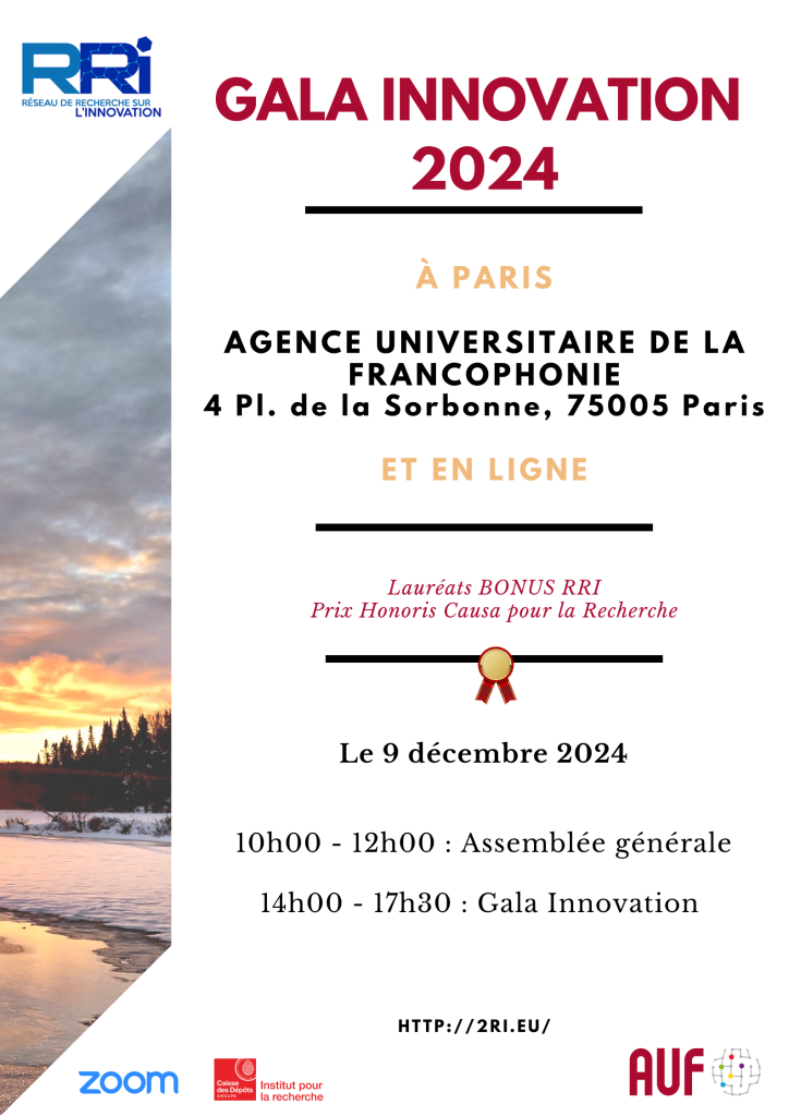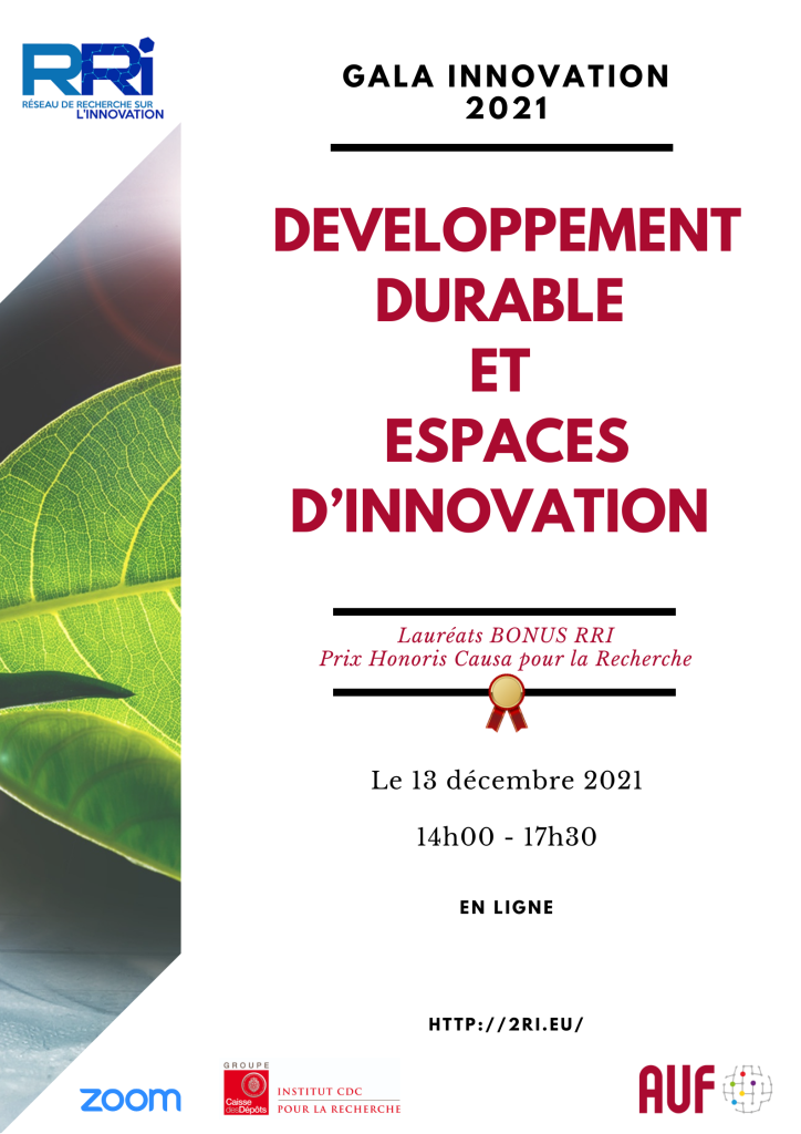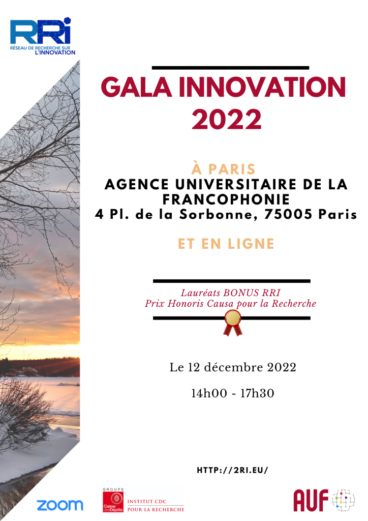 14h30 : Remise du Bonus RRI, proposé par le Réseau de Recherche sur l’Innovation (RRI), l’Institut Caisse des Dépôts pour la Recherche (CDC) et l’Agence Universitaire pour la Francophonie (AUF)